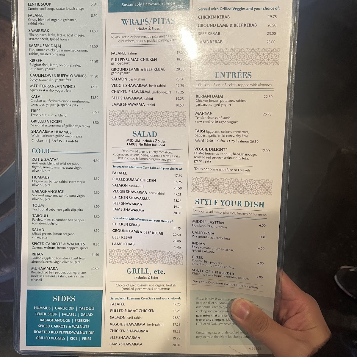 Guests can find satisfying options like hearty Mansaf and tender Rayesh Rack of Lamb alongside lighter choices such as veggie samplers and crisp salads. Wraps and homemade pita sandwiches make for convenient meals on the go, while hot appetizers deliver warm, flavorful starts that invite sharing. To complement the food, refreshing drinks like mint lemonade and thoughtfully prepared smoothies provide subtle sweetness and balance.